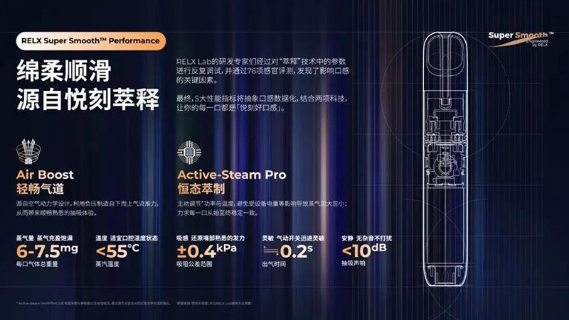 RELX 5代電子煙機內置智能芯片,能夠自動調節電力輸出,保證每次吸食都有穩定的口感和煙霧效果。