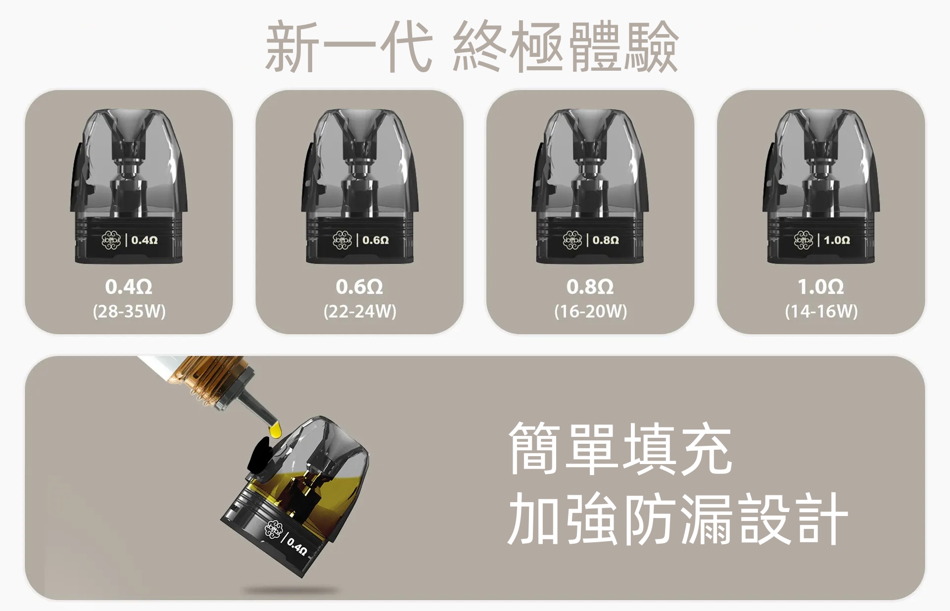 (0.4Ω / 0.6Ω / 0.8Ω / 1.0Ω),適配不同霧化風格