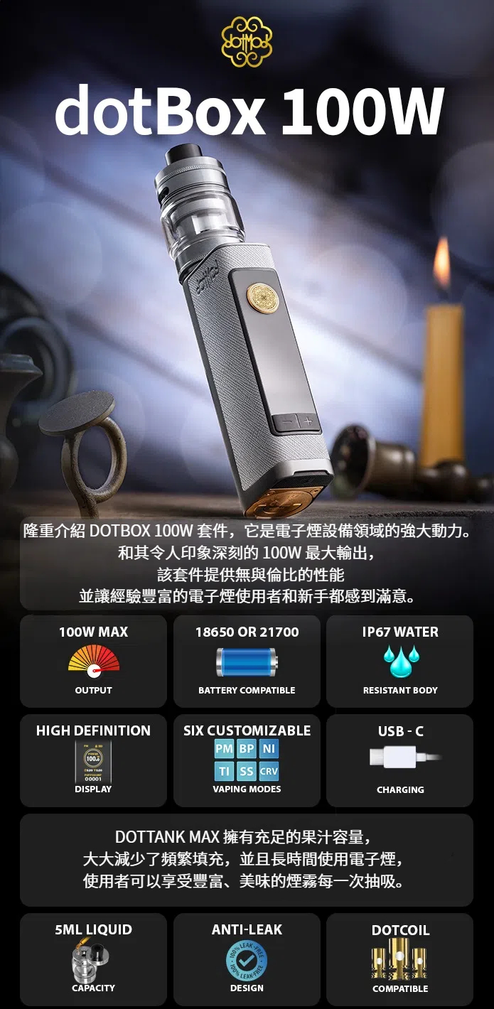 - 商品名稱: Dotmod DotBox 100W 佩特里-18650電池21700電池