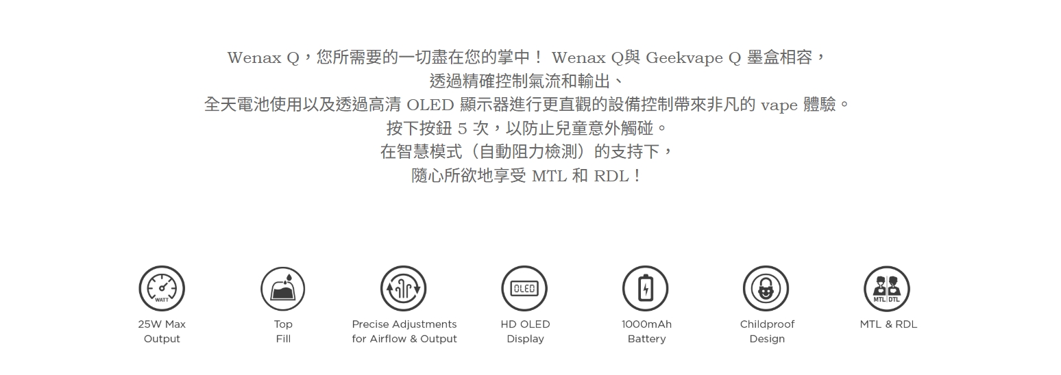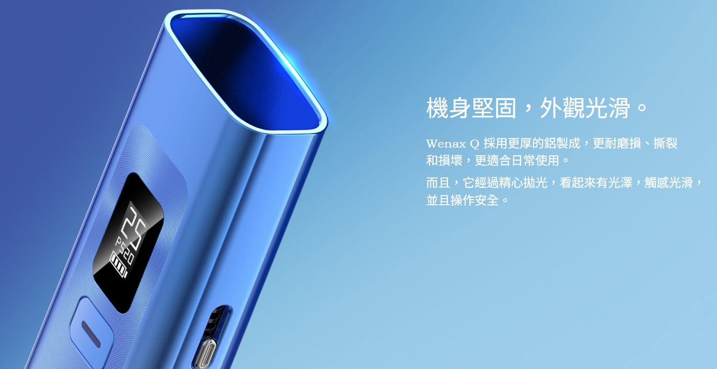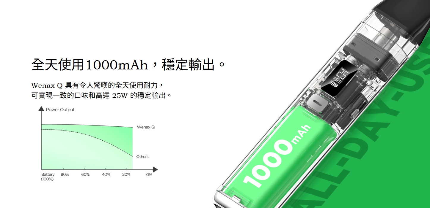 全天使用1000mAh,輸出穩定Wenax Q 具有驚人的全天使用耐久性,並可實現一致的風味和高達 25W 的穩定輸出。