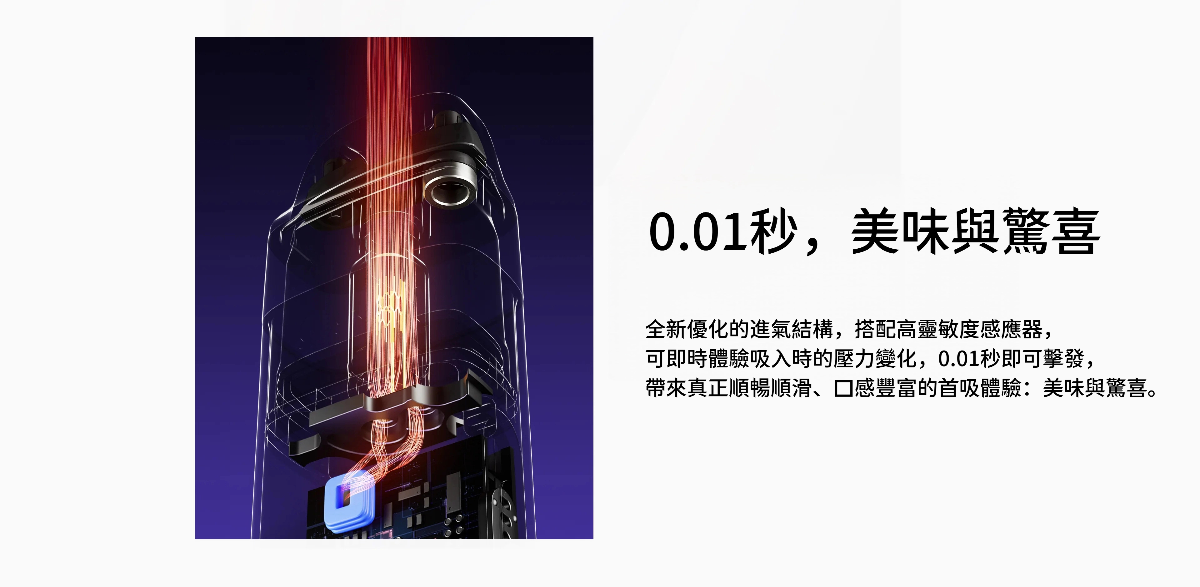 其超快的 0.01 秒點燃速度,可零延遲地提供即時蒸汽 每次吸入都感覺無縫且直觀。