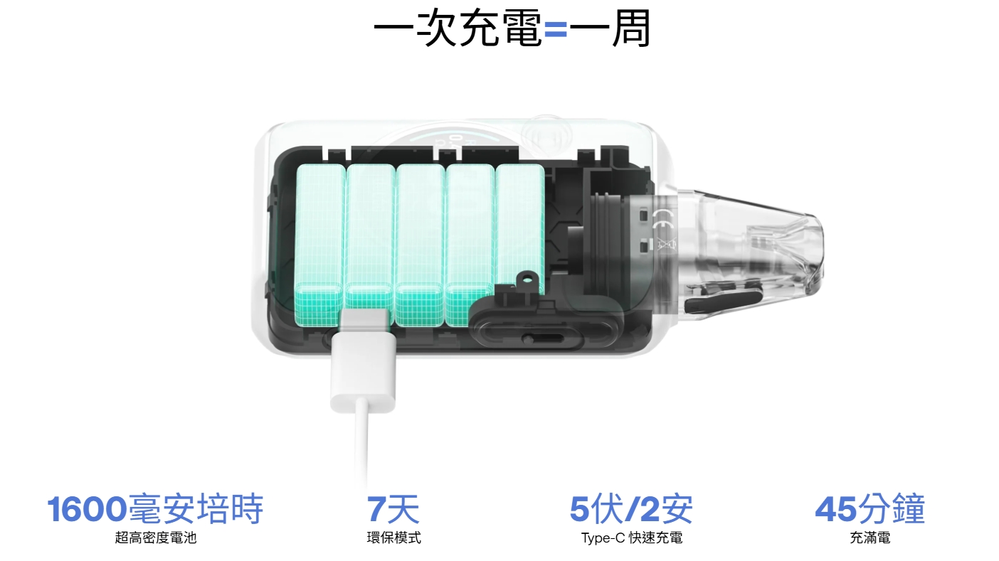續航力極佳,一次充電可使用 1.5–3 天,支援 2A 快充,30 分鐘內充飽。