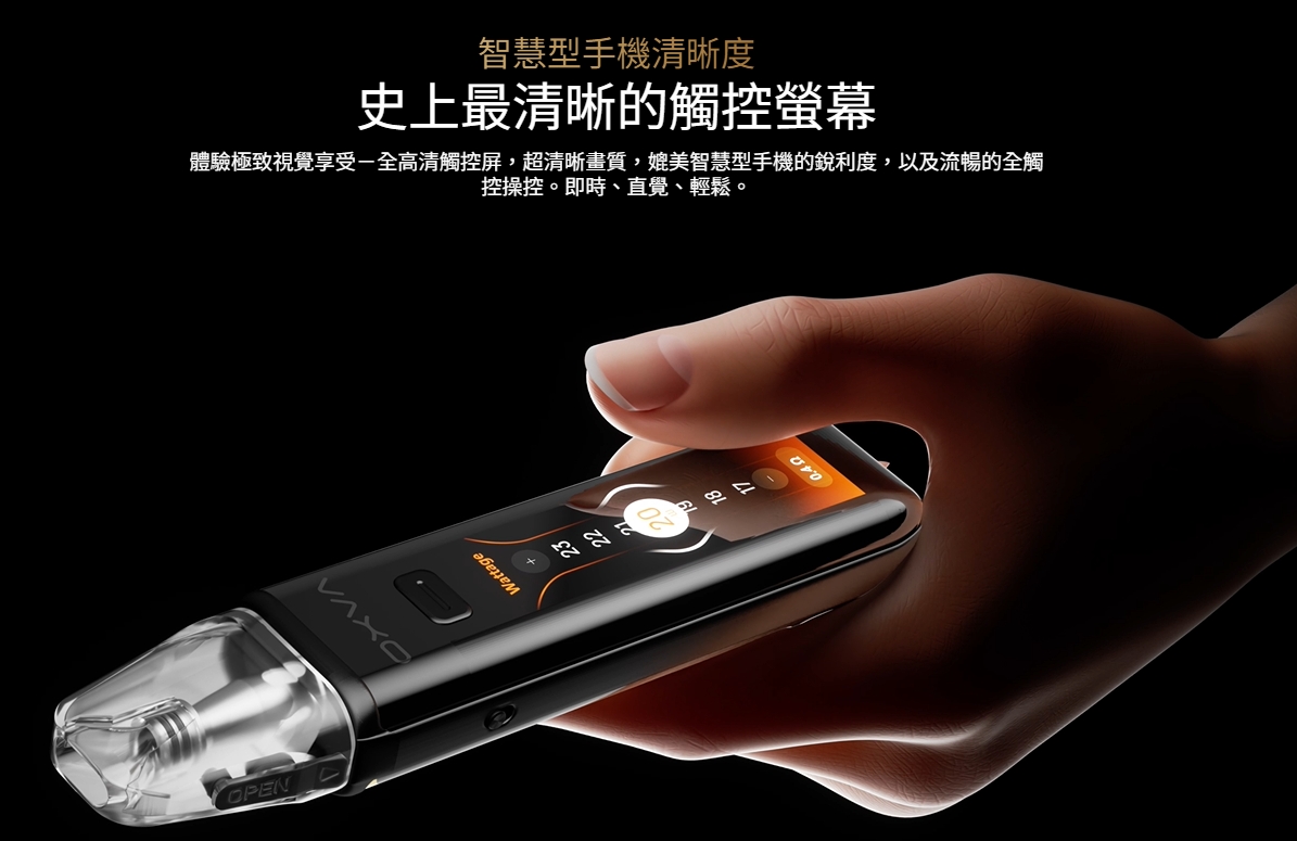 配備 2.2 吋高畫質全觸控螢幕,資訊(電池電量、輸出功率、電阻值、吸煙次數等)一目了然,