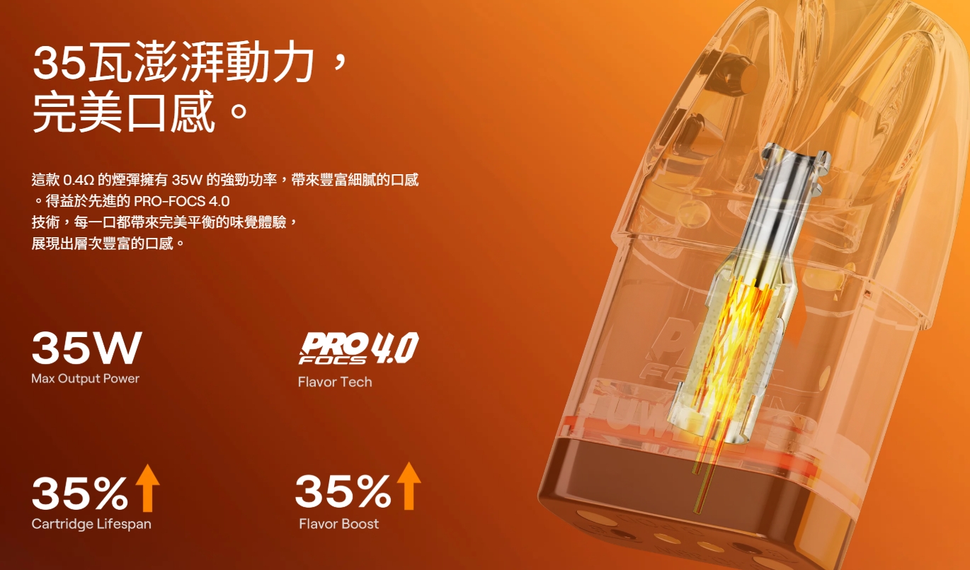 與前代產品相比,使用者可享受煙彈壽命和風味濃度顯著提升 35% 的雙重優勢。