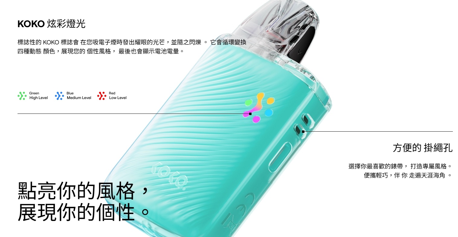 配備 KOKO 炫彩燈在使用過程中會閃爍變色的 KOKO 標誌以及內置掛繩孔,