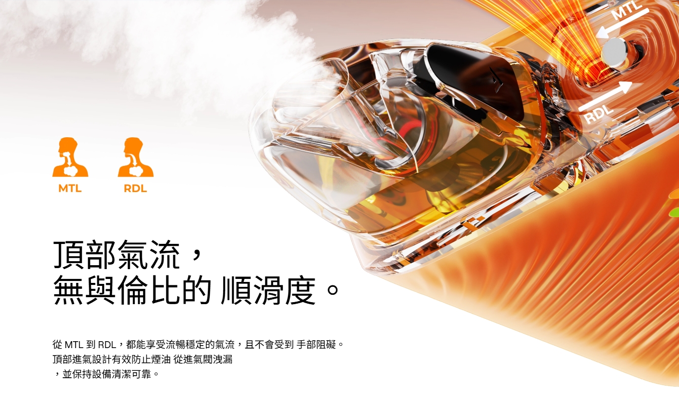 結合了無段側面控制和可逆式煙彈氣流,可在 MTL 和 RDL 之間無縫切換。