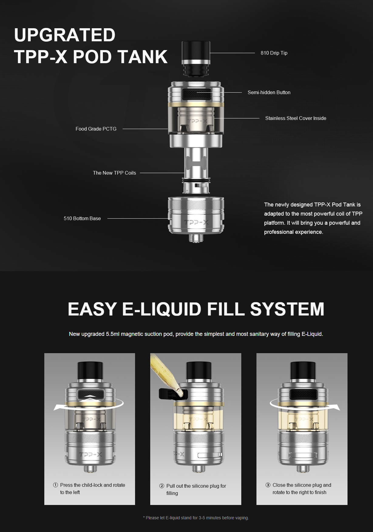 配備了 TPP Pod Tank,容量達到 5.5mL,比之前的 PnP Pod Tank 更大。