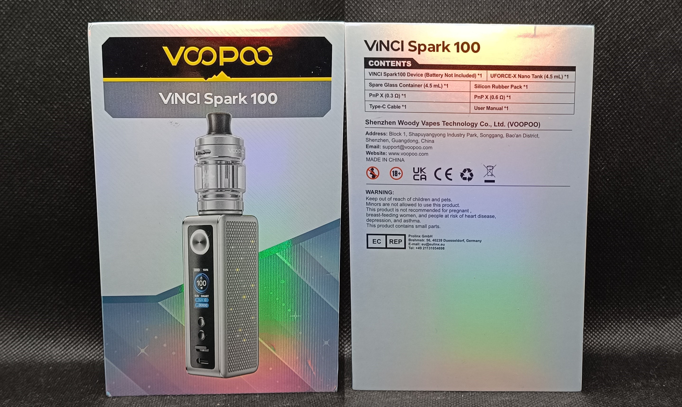 包裝盒背面頂部也印有設備名稱 📝下方列出了包裝內容📦然後是地址、聯絡資訊 📍📞,以及關於尼古丁使用的警告 ⚠️🚭